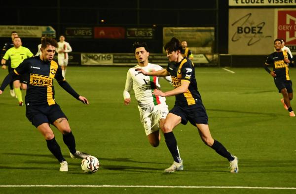 Ei zo na scoorde Thes een derde keer in de eerste helft. In de blessuretijd dwong Jeunen nog een hoekschop af. Het was Voca die hem voor zijn rekening nam en de bal belandde na enige tijd bij L Vermijl. Hij probeerde het vanop een afstand en zag zijn schot tegen de pal uit elkaar spatten. De ruststand was 2-1, maar die had zomaar 3-1 kunnen zijn.
